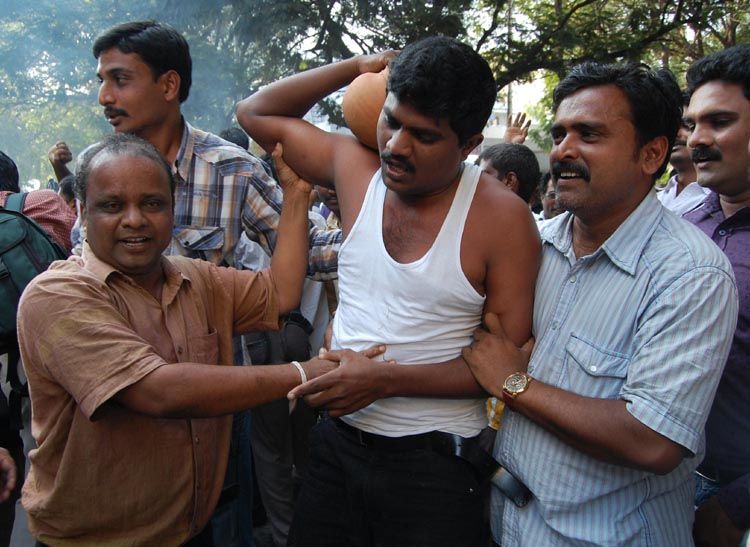Supporters of Kadapa MP YS Jaganmohan Reddy burn effigies depicting Congress president Sonia Gandhi and party general secretary Rahul Gandhi at Banjara Hills in Hyderabad on Monday. INN Photos