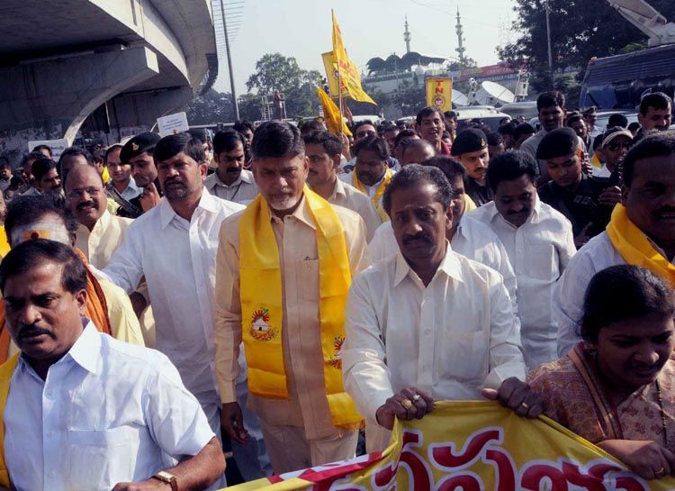 TDP president N Chandrababu Naidu, along with Left parties leaders staged a rasta roko in front of the Assembly in Hyderabad on Monday. Later police took Naidu and other TDP, Left MLA's into their custody. They were shifted to Goshamahal PS where the leaders continued their protest. INN Photos