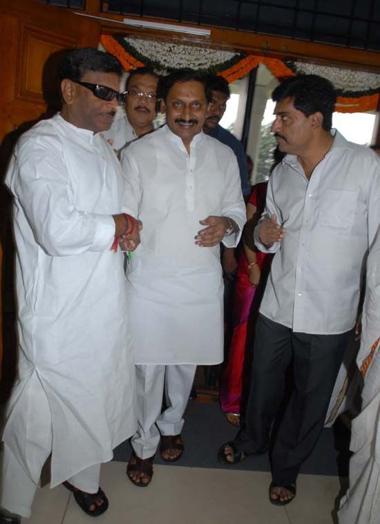 Chief Minister N Kiran Kumar Reddy set his best foot forward to enter into renovated CM camp office-cum-residence at Begumpet on Friday morning. Earlier he performed formal 'gruhapravesa puja' with his family members. Ministers met KKR at his camp office conveyed their wishes. Minister Kasu Krishna Reddy welcoming KKR in his camp office.