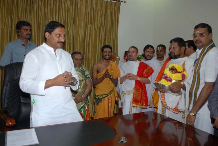 Chief Minister N Kiran Kumar Reddy being blessed with Vedaaseervachanam by pundits in CM camp office-cum-residence at Begumpet on Friday morning. Earlier he performed formal 'gruhapravesa puja' with his family members. Ministers met KKR at his camp office conveyed their wishes.
