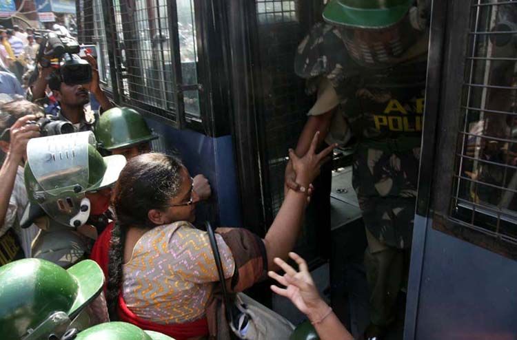 Women members of the Telangana Political Joint Action Committee and other Telangana protagonists being arrested by police after they launched a silent protest, demanding that the paramilitary forces are withdrawn, at Osmania University in Hyderabad on Saturday. INN Photos