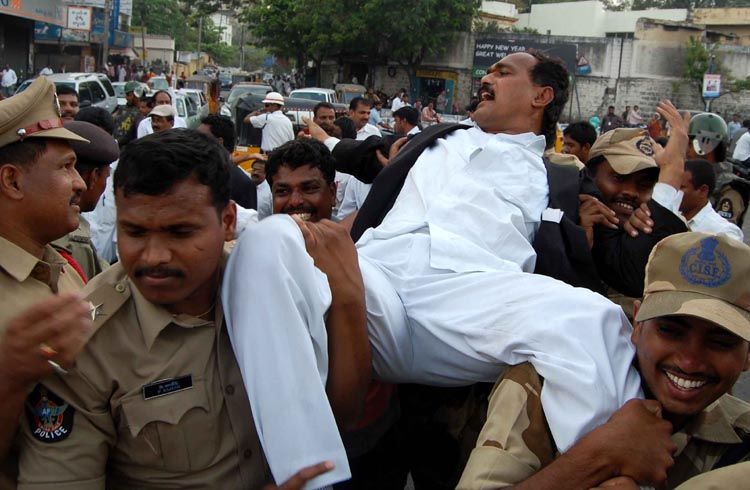 Police arrest protesting lawyers who tried to lay seige to the Raj Bhavan in Hyderabad on Monday. INN Photos