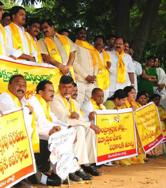 TDP legislators under the leadership of the Party President N.Chandra Babu Naidu during a Dharna in front of the Assembly demanding Fees reimbursements for the students of SC,ST,BC and Minorities in Hyderabad on Friday. INN photos