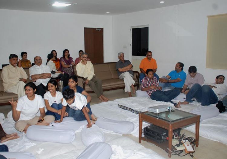 Former chief minister, Telugu Desam party President Nara Chandrababu Naidu watching live telecast of India - Pakistan World Cup semi final match along with family members at his home in Jubilee Hills on Wednesday.