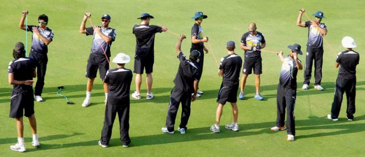 Members of the Deccan Chargers train at the Rajiv Gandhi International Stadium at Uppal in Hyderabad on Tuesday. They earlier posed for lensmen at a promotional event. INN Photos