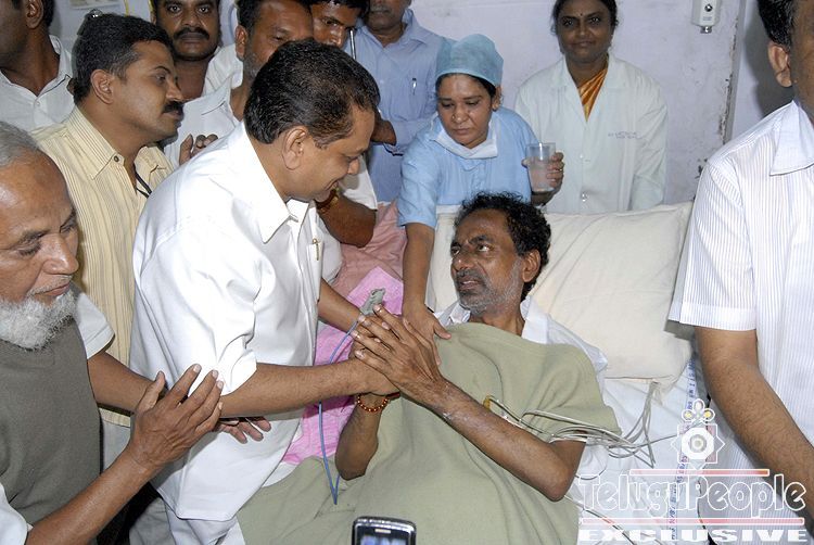 TRS president K. Chandrasekhar Rao ends his 11 day fast by accepting a glasss of lime juice from party leaders and others at the Nizam's Institute of Medical Science on Thursday.