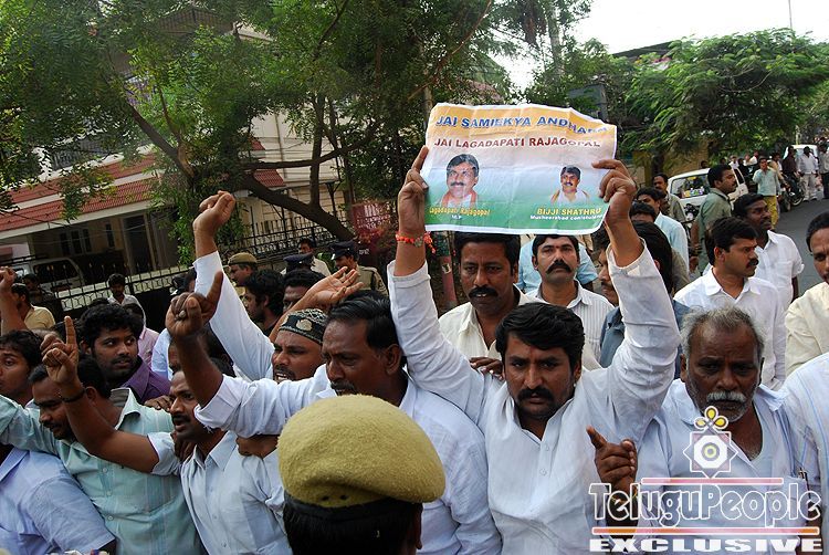 Police arrest Lagadapati Rajagopal, wearing black jacket, a ruling party lawmaker from Vijayawada who was preparing to begin a high-profile hunger strike to protest the splitting of the state, in Hyderabad, India, Monday, Dec. 14, 2009. Most trains and buses started running again Monday and businesses and schools reopened in Andhra Pradesh state following three days of violent protests against the government's plan to split up the southern Indian state. The lawmaker was freed hours later.