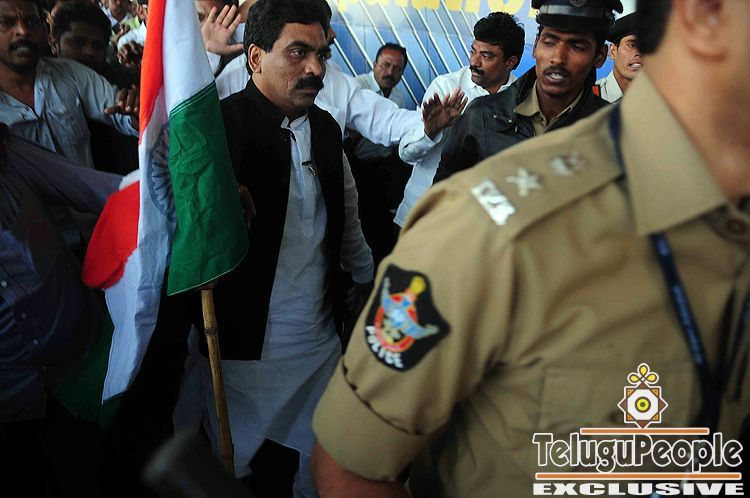 Police arrest Lagadapati Rajagopal, wearing black jacket, a ruling party lawmaker from Vijayawada who was preparing to begin a high-profile hunger strike to protest the splitting of the state, in Hyderabad, India, Monday, Dec. 14, 2009. Most trains and buses started running again Monday and businesses and schools reopened in Andhra Pradesh state following three days of violent protests against the government's plan to split up the southern Indian state. The lawmaker was freed hours later.