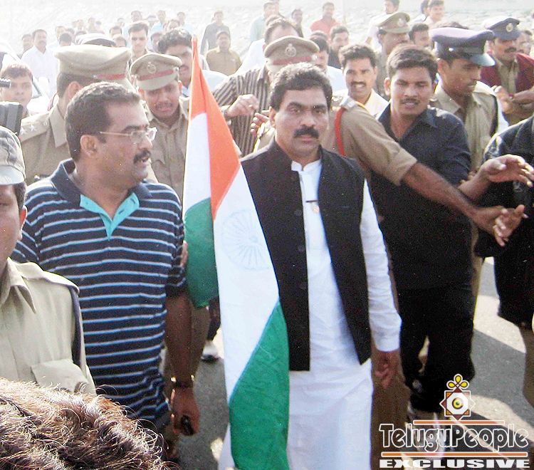 Police arrest Lagadapati Rajagopal, wearing black jacket, a ruling party lawmaker from Vijayawada who was preparing to begin a high-profile hunger strike to protest the splitting of the state, in Hyderabad, India, Monday, Dec. 14, 2009. Most trains and buses started running again Monday and businesses and schools reopened in Andhra Pradesh state following three days of violent protests against the government's plan to split up the southern Indian state. The lawmaker was freed hours later.