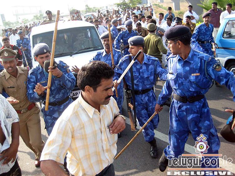 Police arrest Lagadapati Rajagopal, wearing black jacket, a ruling party lawmaker from Vijayawada who was preparing to begin a high-profile hunger strike to protest the splitting of the state, in Hyderabad, India, Monday, Dec. 14, 2009. Most trains and buses started running again Monday and businesses and schools reopened in Andhra Pradesh state following three days of violent protests against the government's plan to split up the southern Indian state. The lawmaker was freed hours later.