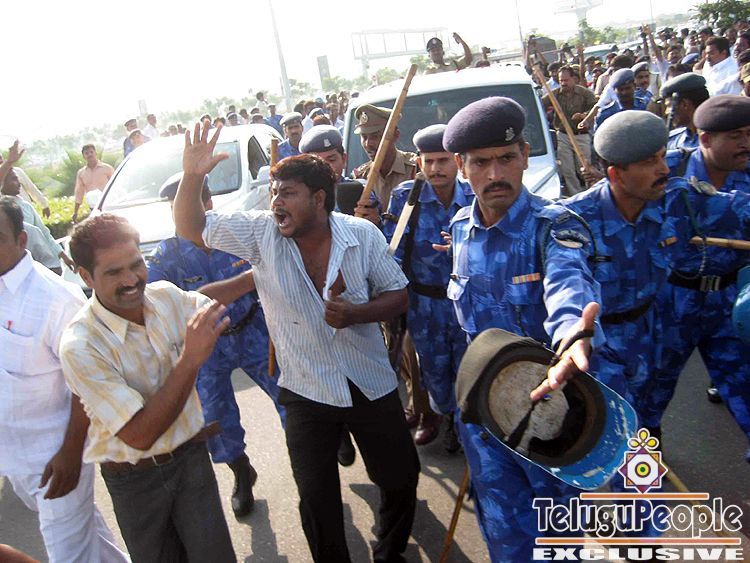 Police arrest Lagadapati Rajagopal, wearing black jacket, a ruling party lawmaker from Vijayawada who was preparing to begin a high-profile hunger strike to protest the splitting of the state, in Hyderabad, India, Monday, Dec. 14, 2009. Most trains and buses started running again Monday and businesses and schools reopened in Andhra Pradesh state following three days of violent protests against the government's plan to split up the southern Indian state. The lawmaker was freed hours later.