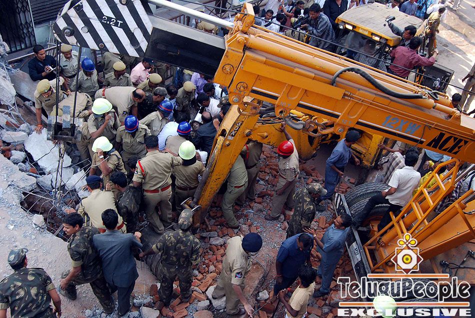 Rescue workers cleared the rubble with bare hands after a three-storied building under construction collapsed in the busy Narayanguda locality on Friday afternoon. Ten persons were confirmed killed, while there is no clarity on the number of workers trapped underneath the debris. Panic spread in the busy locality after the building adjacent to Brilliant Grammar School collapsed around 2.30 p.m. Students from the building were evacuated immediately even as worried parents rushed to the school.Hundreds of civilians were assisting the police, fire services department in clearing the debris, even as bull dozers, poclains and gas cutting equipment were being moved to the site. The collapsed building is on the busy Barkatpura-Himayatnagar stretch and with thousands of curious people rushing there, it was becoming difficult for the police to move the cranes and other equipment to the site.