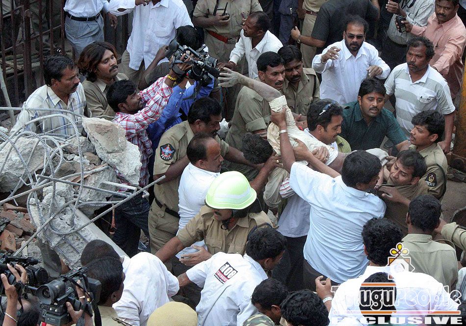 Rescue workers cleared the rubble with bare hands after a three-storied building under construction collapsed in the busy Narayanguda locality on Friday afternoon. Ten persons were confirmed killed, while there is no clarity on the number of workers trapped underneath the debris. Panic spread in the busy locality after the building adjacent to Brilliant Grammar School collapsed around 2.30 p.m. Students from the building were evacuated immediately even as worried parents rushed to the school.Hundreds of civilians were assisting the police, fire services department in clearing the debris, even as bull dozers, poclains and gas cutting equipment were being moved to the site. The collapsed building is on the busy Barkatpura-Himayatnagar stretch and with thousands of curious people rushing there, it was becoming difficult for the police to move the cranes and other equipment to the site.