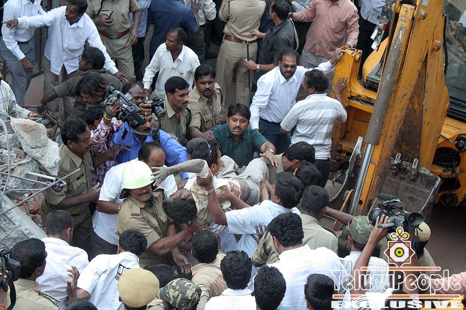 Rescue workers cleared the rubble with bare hands after a three-storied building under construction collapsed in the busy Narayanguda locality on Friday afternoon. Ten persons were confirmed killed, while there is no clarity on the number of workers trapped underneath the debris. Panic spread in the busy locality after the building adjacent to Brilliant Grammar School collapsed around 2.30 p.m. Students from the building were evacuated immediately even as worried parents rushed to the school.Hundreds of civilians were assisting the police, fire services department in clearing the debris, even as bull dozers, poclains and gas cutting equipment were being moved to the site. The collapsed building is on the busy Barkatpura-Himayatnagar stretch and with thousands of curious people rushing there, it was becoming difficult for the police to move the cranes and other equipment to the site.