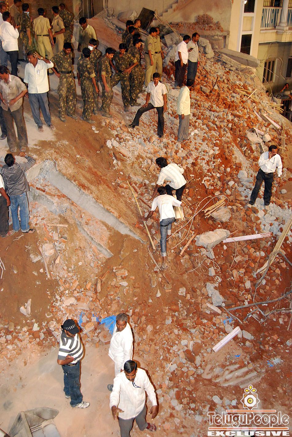Rescue workers cleared the rubble with bare hands after a three-storied building under construction collapsed in the busy Narayanguda locality on Friday afternoon. Ten persons were confirmed killed, while there is no clarity on the number of workers trapped underneath the debris. Panic spread in the busy locality after the building adjacent to Brilliant Grammar School collapsed around 2.30 p.m. Students from the building were evacuated immediately even as worried parents rushed to the school.Hundreds of civilians were assisting the police, fire services department in clearing the debris, even as bull dozers, poclains and gas cutting equipment were being moved to the site. The collapsed building is on the busy Barkatpura-Himayatnagar stretch and with thousands of curious people rushing there, it was becoming difficult for the police to move the cranes and other equipment to the site.