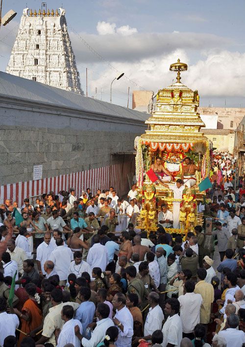 On the occassion of Varalakshmi Vratham, the processional deity of Goddess Padmavathi is taken out in a procession atop GOLDEN CHARIOT around four mada street of Sri Padmavathi Ammavari Temple, Tiruchanur on Friday evening.