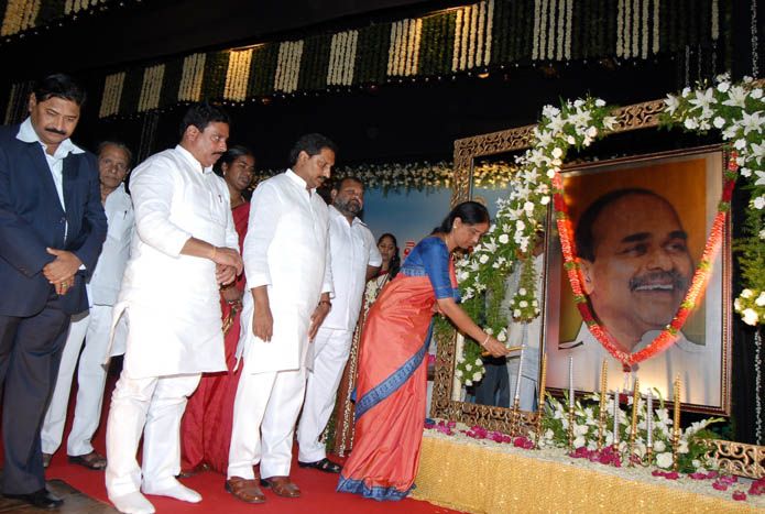 Home Minister P Sabitha Indra Reddy lights a lamp as part of the tributes to former chief minister late YS Rajasekhara Reddy on the occasion of his first death anniversary at Ravindra Bharati in Hyderabad on Thursday. Assembly Speaker Kiran Kumar Reddy, Minister for BC Welfare Mukesh Goud and Health Minister D Nagender, along with I and PR Commissioner C Parthasarathi are also seen. INN Photos