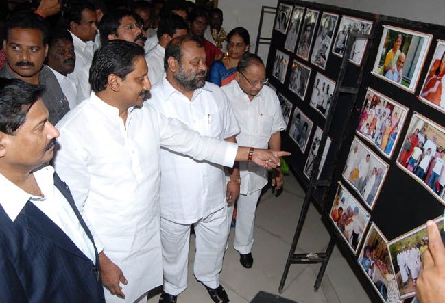 Legislative Assembly Speaker N Kiran Kumar Reddy, Home Minister P Sabitha Indra Reddy, Minister for BC Welfare Mukesh Goud and Health Minister D Nagender at a photo exhibition in connection the former chief minister late YS Rajasekhara Reddys first death anniversary at Ravindra Bharati in Hyderabad on Thursday. INN Photos