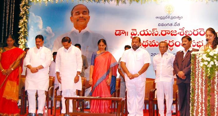 Assembly Speaker Kiran Kumar Reddy, Home Minister P Sabitha Indra Reddy, Minister for BC Welfare Mukesh Goud and Health Minister D Nagender, Mayor Banda Karthika Reddy along with I and PR Commissioner C Parthasarathi and AP State Cultural Council Chairman RV Ramana Murthyat a book release function in connection the former chief minister late YS Rajasekhara Reddys first death anniversary at Ravindra Bharati in Hyderabad on Thursday. INN Photos