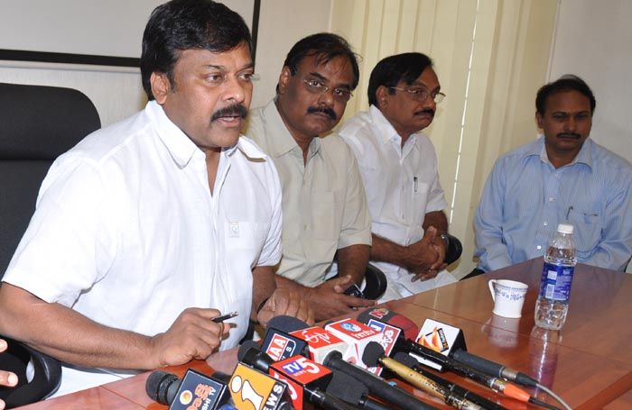 Praja Rajyam Party president K Chiranjeevi addresses media persons at party office in Jubilee Hills in Hyderabad on Wednesday. announced that his next film would be a social message-oriented one, on the lines of the live of Tagore and Stalin. The actor-turned-politician-turned-actor said that shooting for his new film would begin next year. The story is yet to be finalized : INN Photos