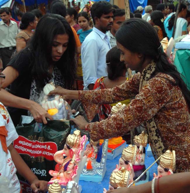 Women buy idols, fruits and flowers in preparation of the Ganesh Chaturthi in Hyderabad on Friday. INN Photos