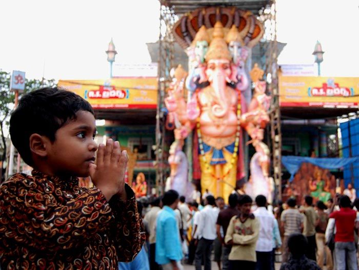 A child prays before the massive Ganesh idol at Khairtabad in Hyderabad on Friday. INN Photos