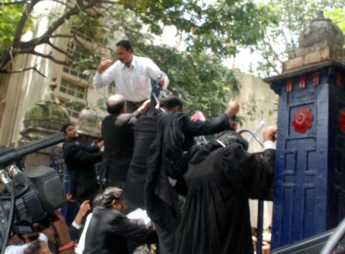 Telangana lawyers continue their protests at the state High Court in Hyderabad on Wednesday, demanding 42 per cent reservations in Judiciary posts. Telangana Jagruti leader Kavita visited the protesting lawyers to extend her support to them. INN Photos