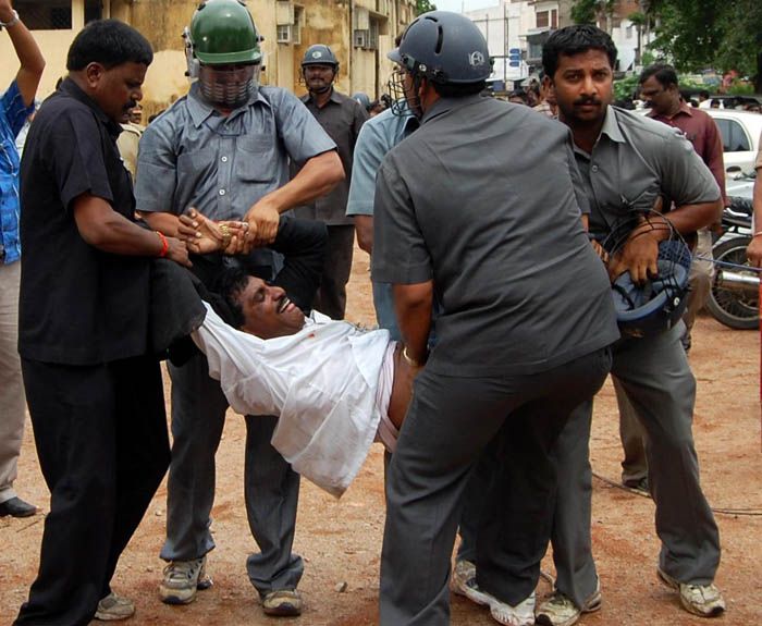 Police take Lawyers and students in custody as they protest at the state High Court on Friday, demanding 42 per cent reservations for Telanganaites in Judiciary posts. Police blocked major roads leading to High Court with barricades and barbed wire fence to prevent agitators entering court premises. INN Photos