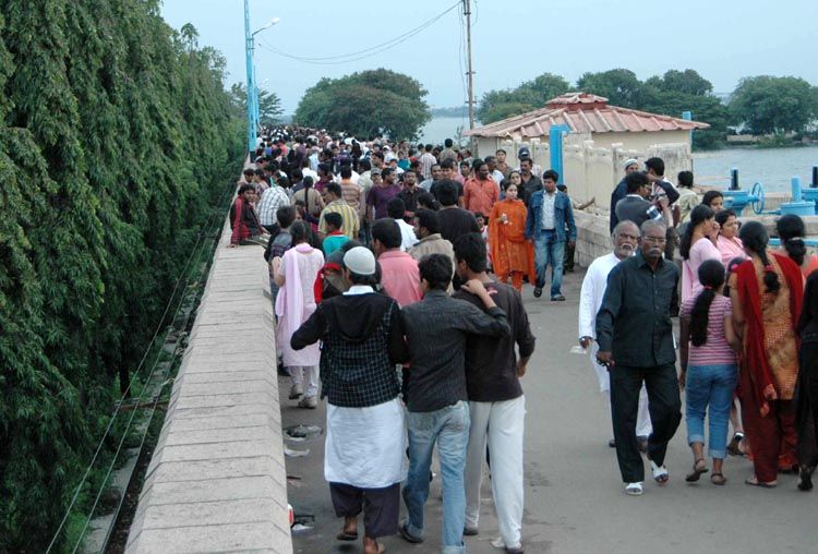 Osman Sagar, hugely popular as Gandipet lake opened the 8th gate, after a decade later on Saturday. It is the first time after inflows reached 1790 feet when 8 gates were open. The last time the gates were opened in 2000 September. Gandipet as a popular tourist destination has lost its charm during last ten years as the reservoir hardly receives inflows to open its gates for surplus flood water. When the news of Gandipet gates were open visitors from twin cities flocked the reservoir in droves to have a rare sight of flood water gushing through its gates. Mir Osman Ali Khan, the VIIth Nizam of Hyderabad city built Osman Sagar dam across river Musi. It covers a catchment area of 46 square kilometers.
