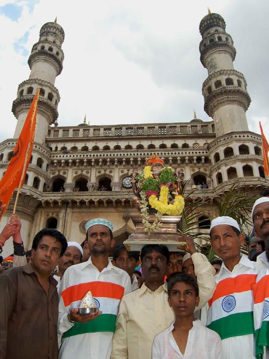 Muslims welcome the Ganesh procession with prasadam near Charminar on Wednesday.