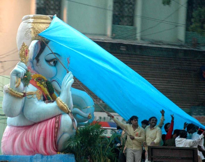 Devotees rush to shield the idols of Lord Ganesh as a sudden downpour threatens to wash away the paint during the immersion procession near Charminar in Hyderabad on Wednesday. INN Photos