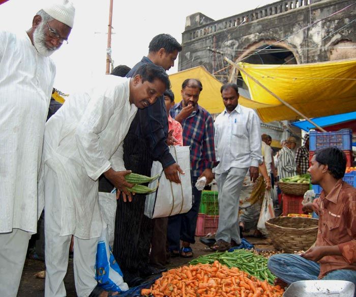 People flock vegetable markets at various vegetable markets in the old city to stock up on essentials in the wake of the Babri Masjid title suit verdict in Hyderabad on Wednesday. INN Photos