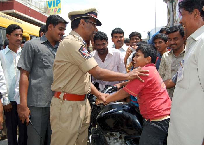 Hyderabad City Police Commissioner AK Khan chides a child biker in the old city while he is on a padayatra to take stock of the situation in the sensitive areas of old city on Friday.