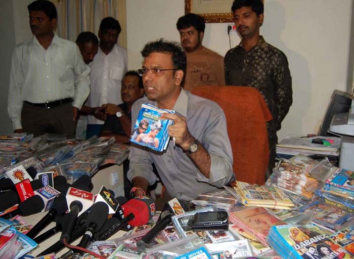 Deputy Commissioner Task Force Srinivas Rao addresses media persons over the seizure of 3015 pirated DVDs of newly released movies in Hyderabad on Tuesday. INN Photos.