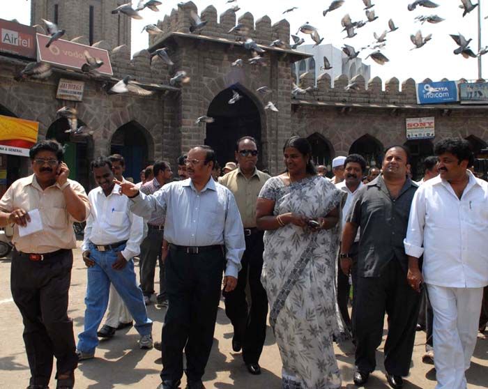 Mayor Banda Karthika Reddy on her field visit to the Moazzam Jahi Market in Hyderabad on Saturday. GHMC officials accompanying her use handkerchiefs to stop the stench from the nearby drains while Ms Karthika Reddy is without any such protection. INN Photos --