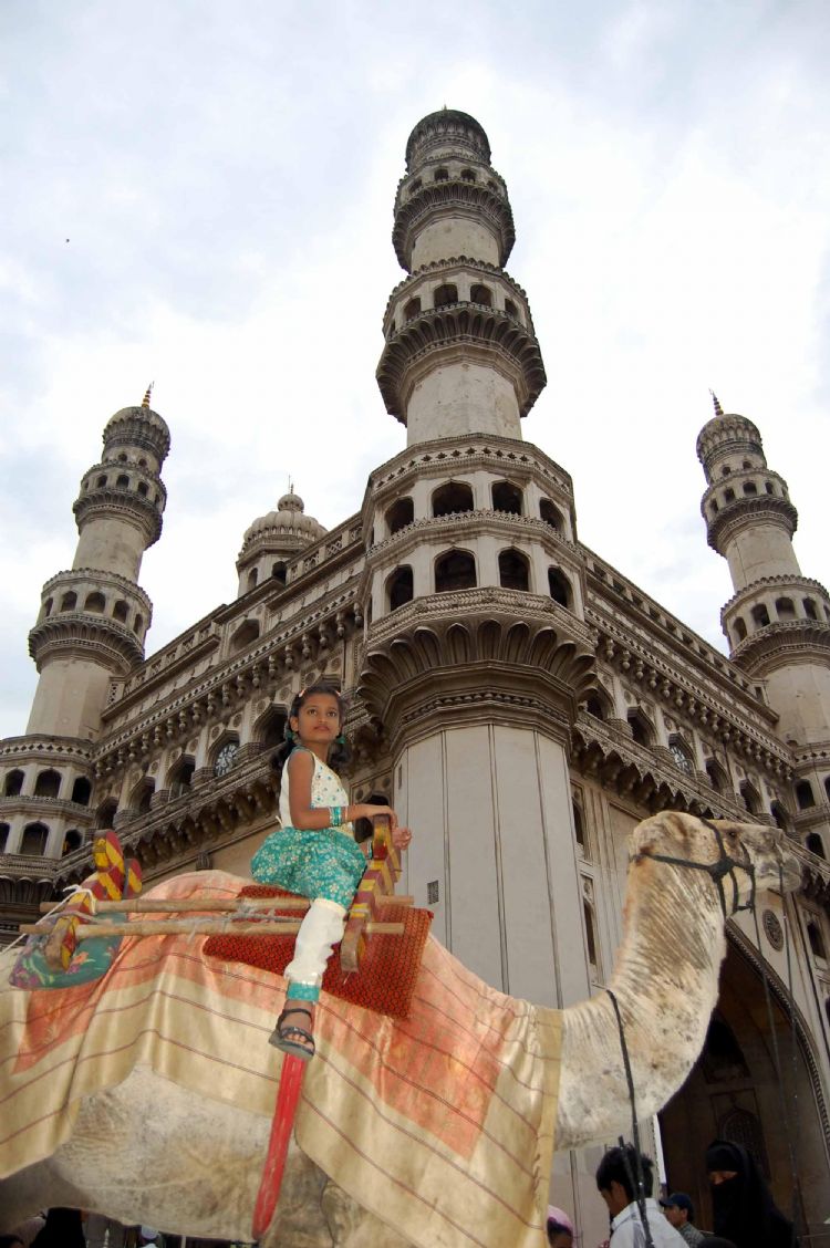 Unmindful of the heavy traffic around Charminar, an enterprising businessman gives rides on his camel to children of devotees who thronged the Bhagyalakshmi temple for special pujas on the eighth day of Dassera, in Hyderabad on Friday. INN Photos