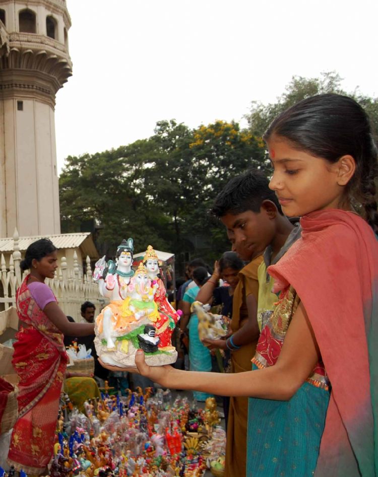 With Dassera around the corner, people buy dolls and ornamental pieces to decorate their homes near Charminar in Hyderabad on Friday. INN Photos