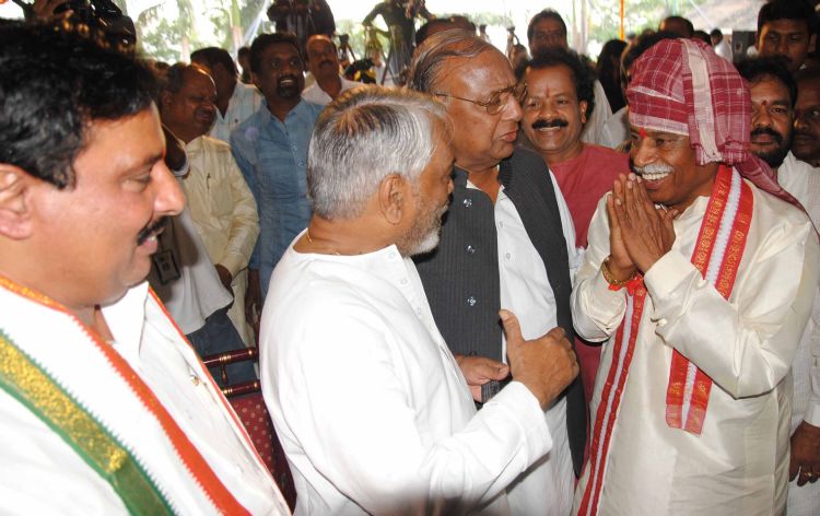 Former Union minister and BJP leader Bandaru dattatreya welcomes K Keshav Rao, V Hanumanth Rao, D Nagender at a Alai-Bhalai (Dussera Milan) function at Jalvihar in Hyderabad on Monday. INN Photos