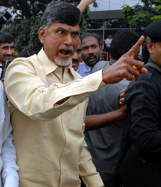 Telugu Desam Party president N Chandrababu Naidu protests at Rasoolpura crossroads after not getting an appointment with Prime Minister Manmohan Singh to submit a memorandum on various issues facing the people of the state. INN Photos