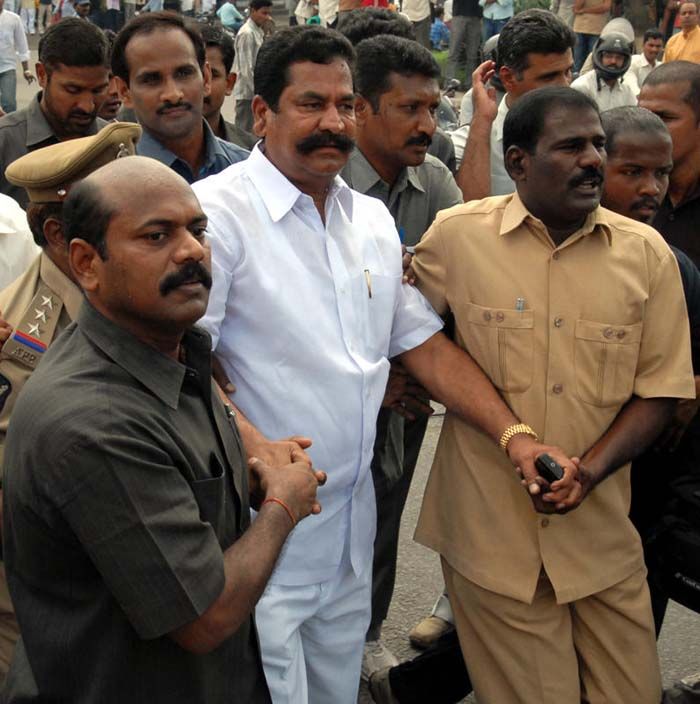 Telugu Desam Party president N Chandrababu Naidu protests at Rasoolpura crossroads after not getting an appointment with Prime Minister Manmohan Singh to submit a memorandum on various issues facing the people of the state. INN Photos