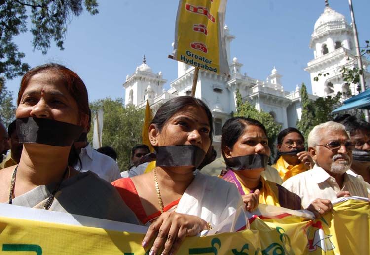 Telugu Desam Party Legislators take out a padayatra from Nampally to the open air auditorium to protest against the proposed renaming of the Lalitha Kala Thoranam at Nampally in Hyderabad on Thursday. INN Photos