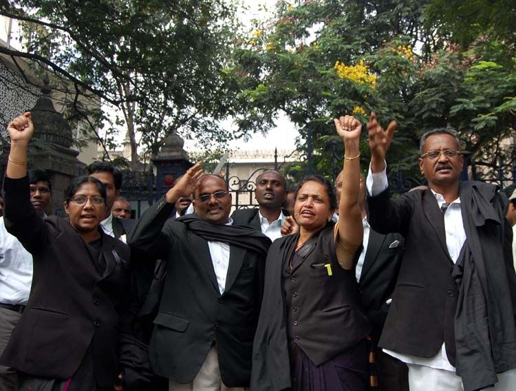 Advocates protest against the AP Formation Day celebrations at the AP High Court in Hyderabad on Monday. INN Photos