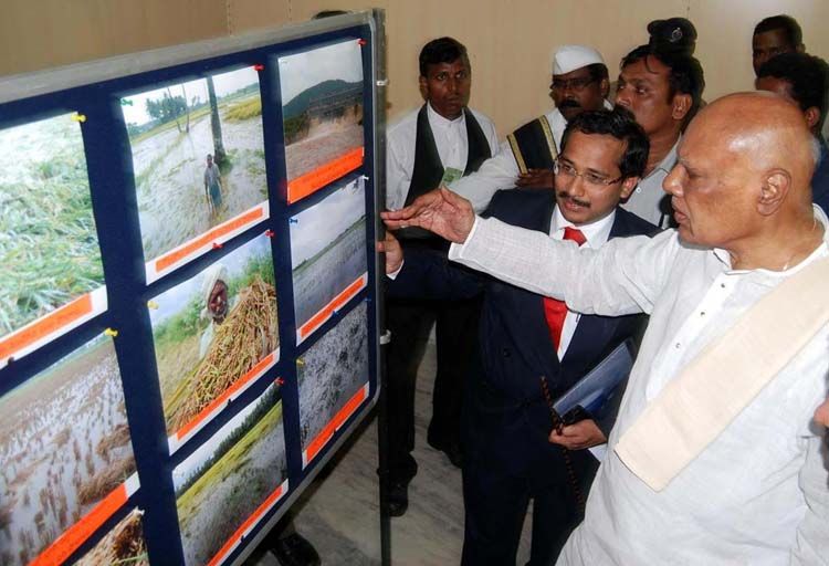 Chief Minister K Rosaiah watching photo exhibition of flood damages in East Godavari district on his arrival at Kakinada on an aerial tour to flood-ravaged Coastal Andhra region on Thursday. INN photos