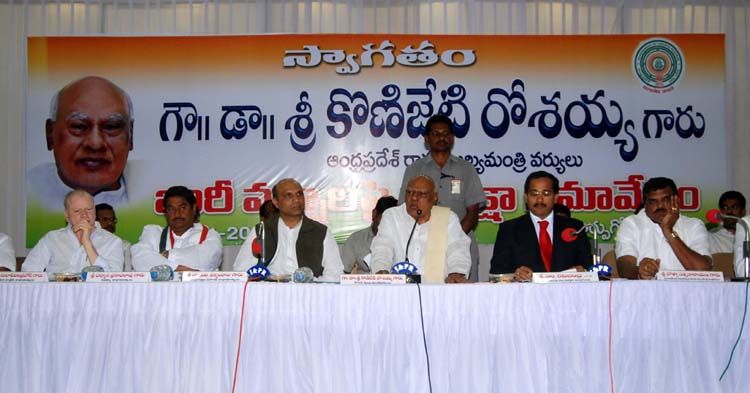 Chief Minister K Rosaiah speaking in a review meeting of flood damages in East Godavari district on his arrival at Kakinada on an aerial tour to flood-ravaged Coastal Andhra region on Thursday. INN photos