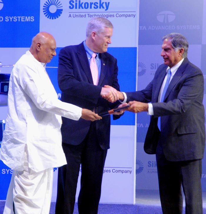 Chief Minister of AP Dr.K.Rosaiah, flanked by Mr.Ratan Tata,Chairman TATA Sons (right) and Mr.Louis Chenevert, Chairman United technologies corporation at the inauguration of the First Sikorsky S-92 helicopter cabin made in India by Tata Advance Systems at Aerospace and Precision engineering SEZ,Adibatla in Hyderabad