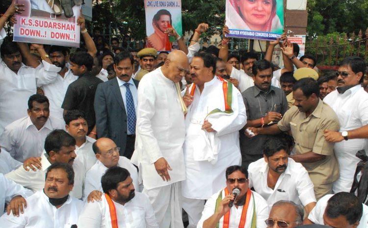 Chief Minister Rosaiah, PCC Chief Srinivas, Ministers, MLA's and MP's join Congress activists in staging a dharna in protest against the provocative statements allegedly made against party president Sonia Gandhi by former RSS chief Sudershan at Basheer Bagh Crossroads in Hyderabad on Friday. INN Photos
