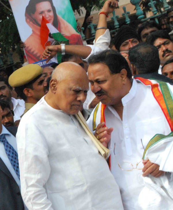 Chief Minister Rosaiah, PCC Chief Srinivas, Ministers, MLA's and MP's join Congress activists in staging a dharna in protest against the provocative statements allegedly made against party president Sonia Gandhi by former RSS chief Sudershan at Basheer Bagh Crossroads in Hyderabad on Friday. INN Photos