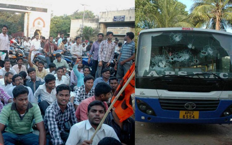 Buses vandalised by students of OU Campus protesting the arrest of aspirants to Sub-Inspectors posts in Hyderabad on Monday. INN Photos