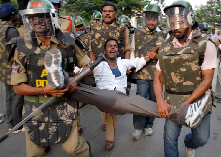 Protest by students at OU demanding cancellation of recruitment test for police Sub-Inspectors. OU students burnt the effigy of MP Kavuri Sambasivarao for his alleged remarks against tribals. Police resort to caning and later arrest the protesters when they tried took out a rally on Tuesday. INN Photos