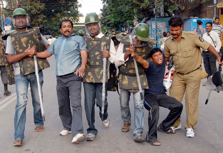 Protest by students at OU demanding cancellation of recruitment test for police Sub-Inspectors. OU students burnt the effigy of MP Kavuri Sambasivarao for his alleged remarks against tribals. Police resort to caning and later arrest the protesters when they tried took out a rally on Tuesday. INN Photos